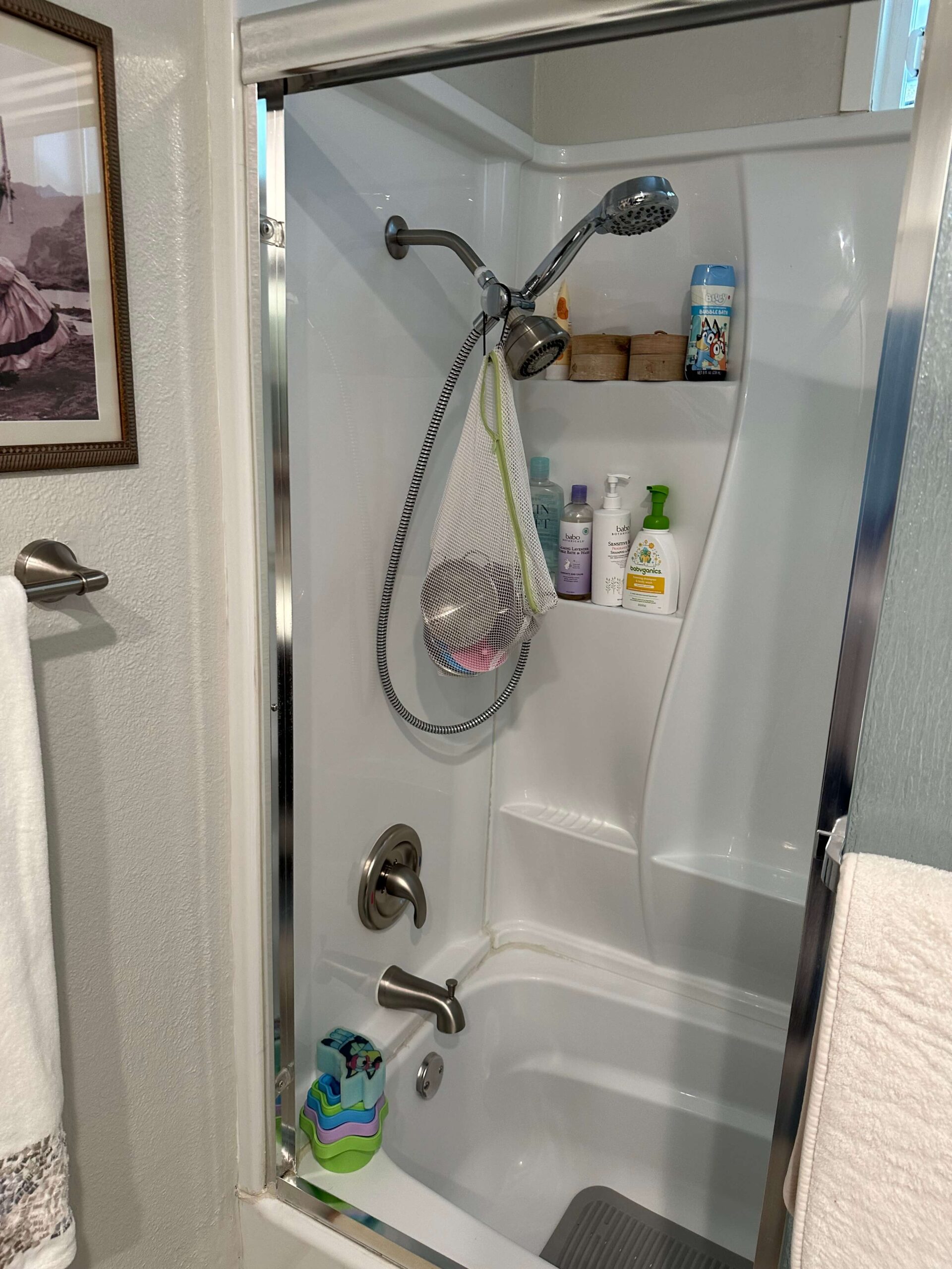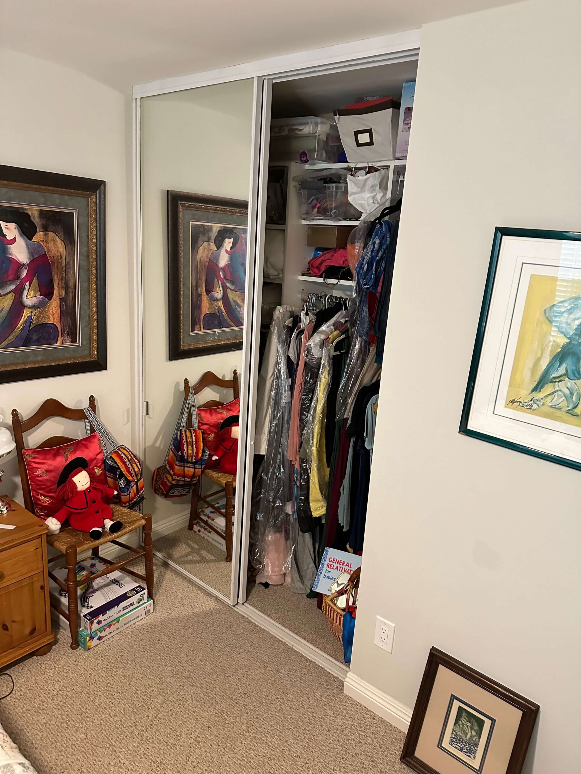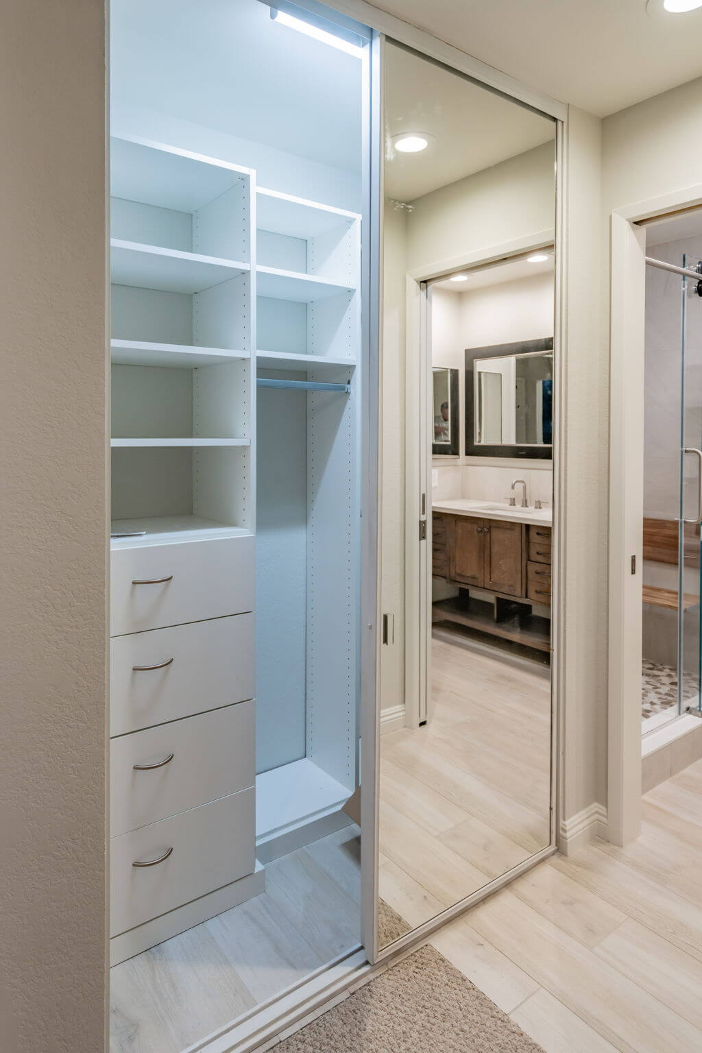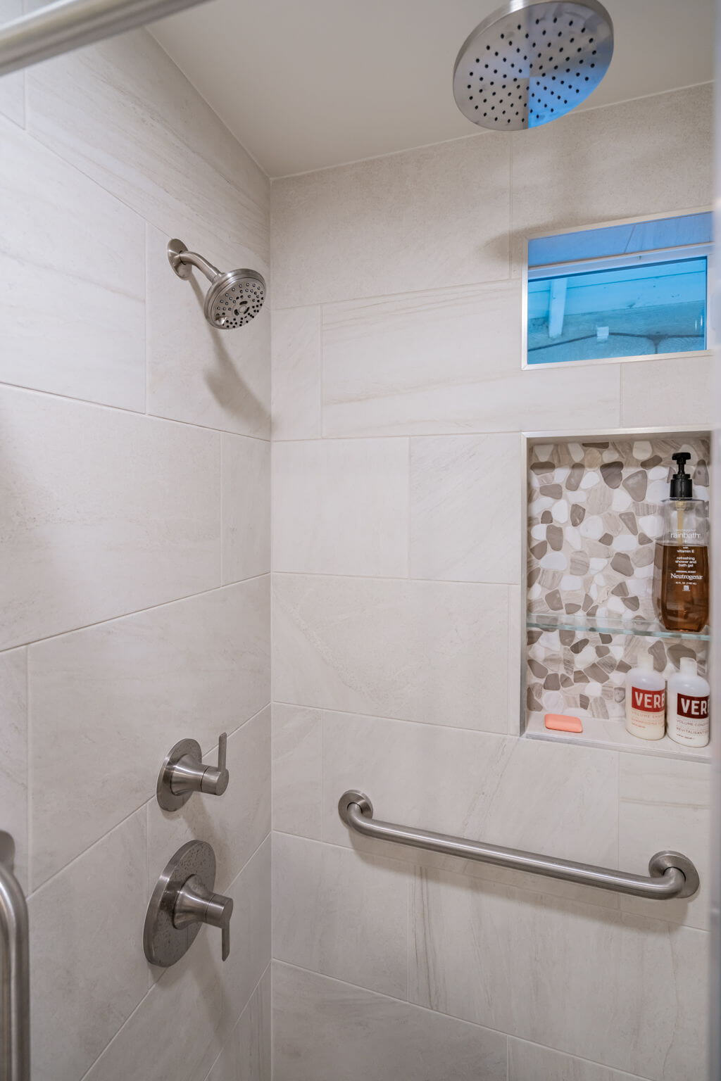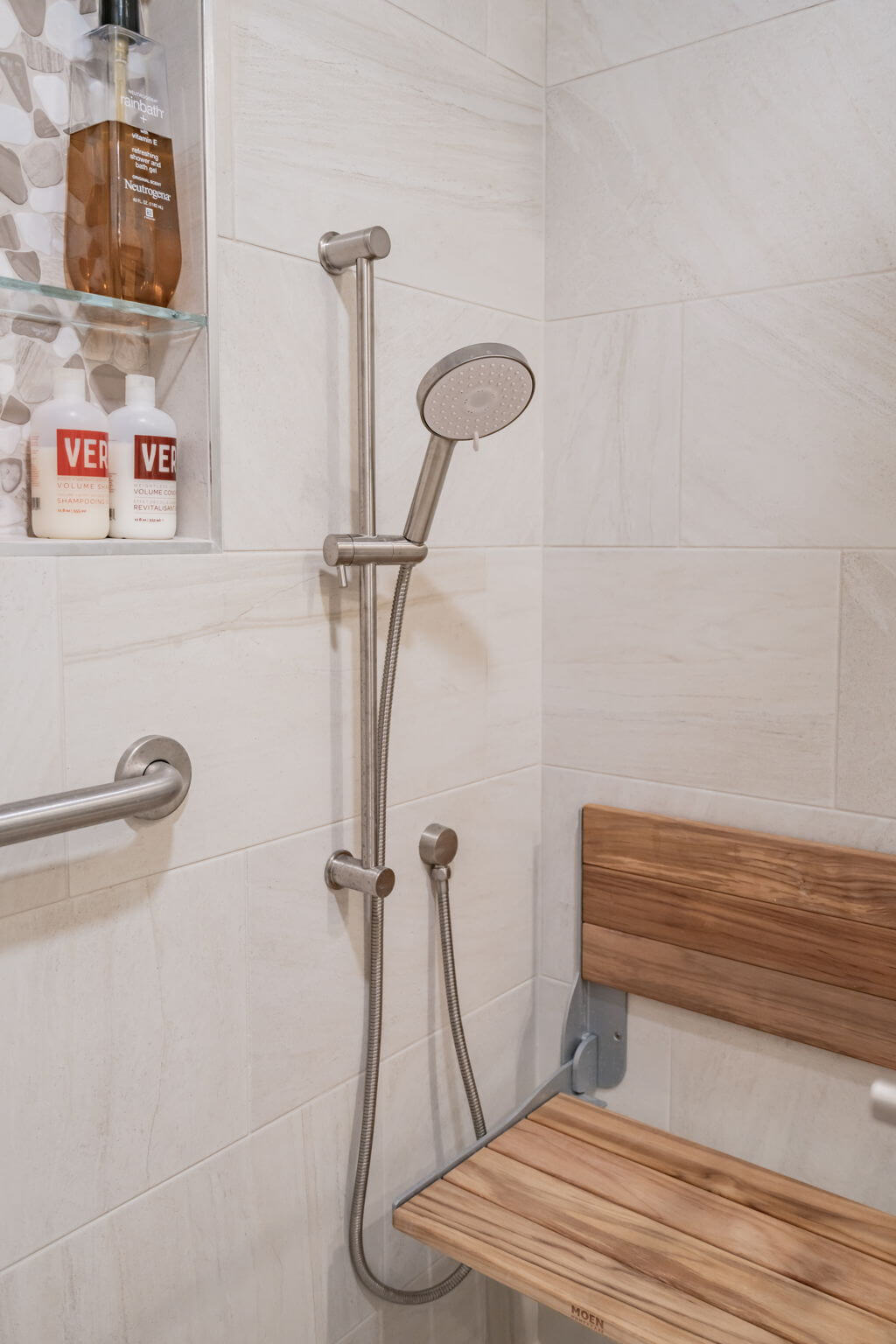 The existing bathtub was replaced with a low-threshold walk-in shower, making entry and exit safe. We included a folding teak seat, strategically placed grab bars, dual shower heads (rain and handheld), and slip-resistant mosaic tile flooring. - Closet Relocation