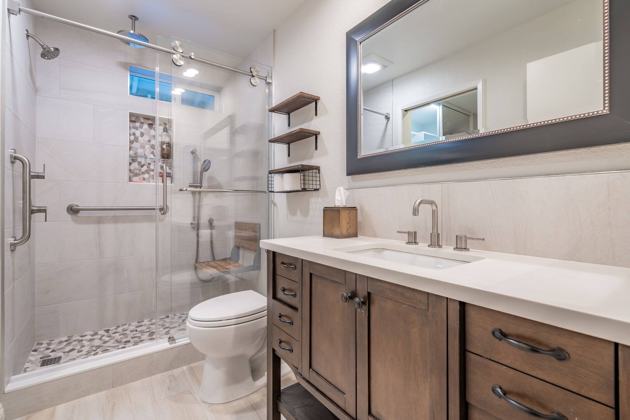 The finished bathroom blends safety, comfort, and style. The walk-in shower provides peace of mind for the family, while the upgraded finishes and thoughtful layout create a calm, spa-like atmosphere. This remodel created a practical solution for aging in place.