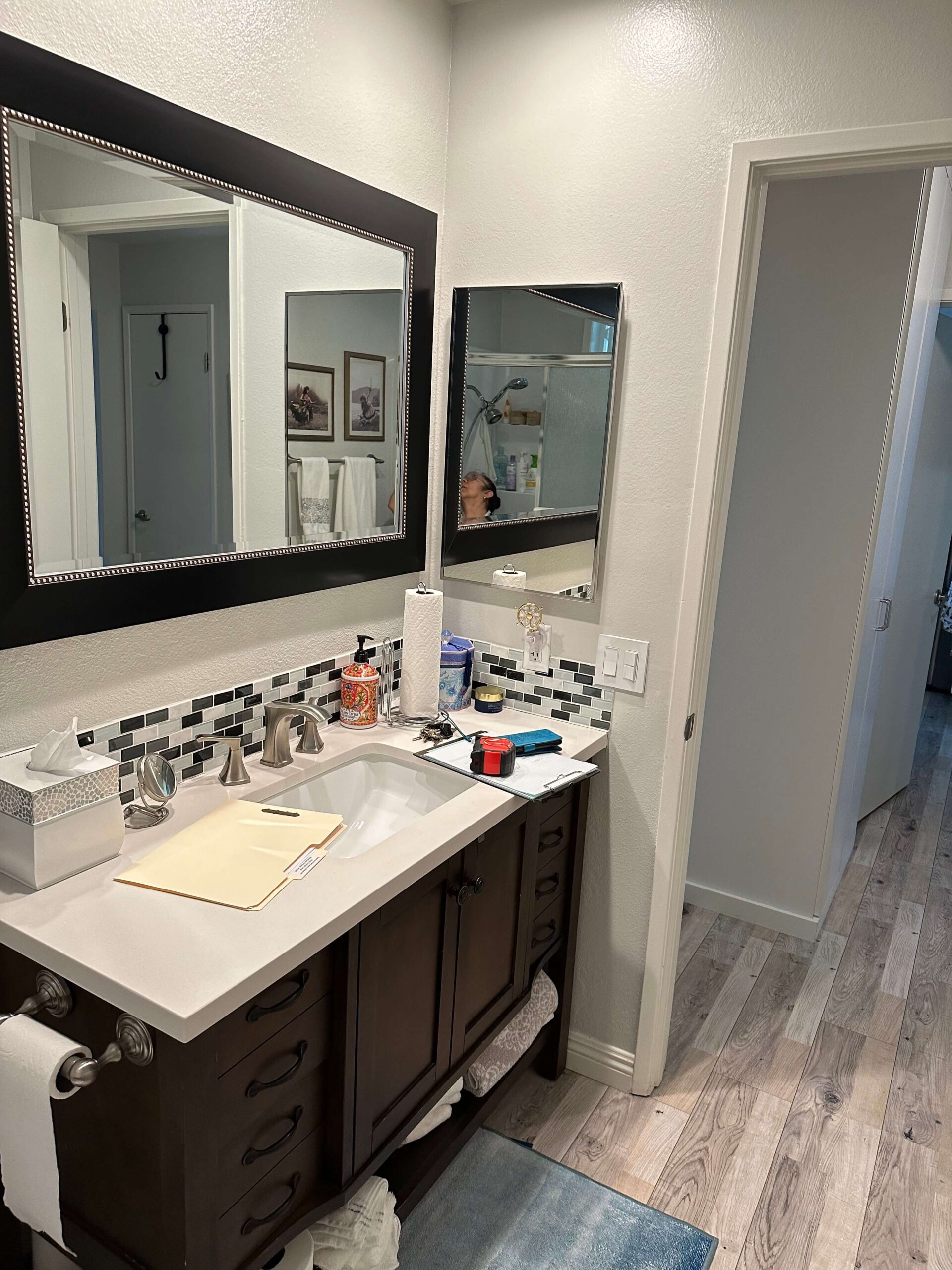 The previous closet location restricted space and flow. By relocating it, we were able to expand the shower area and create a more open, accessible layout. - Upgraded Vanity & Fixtures