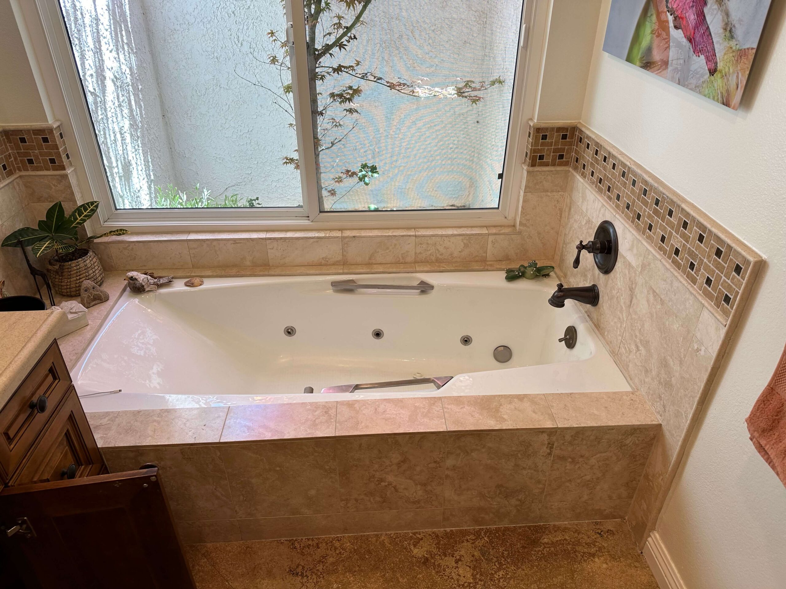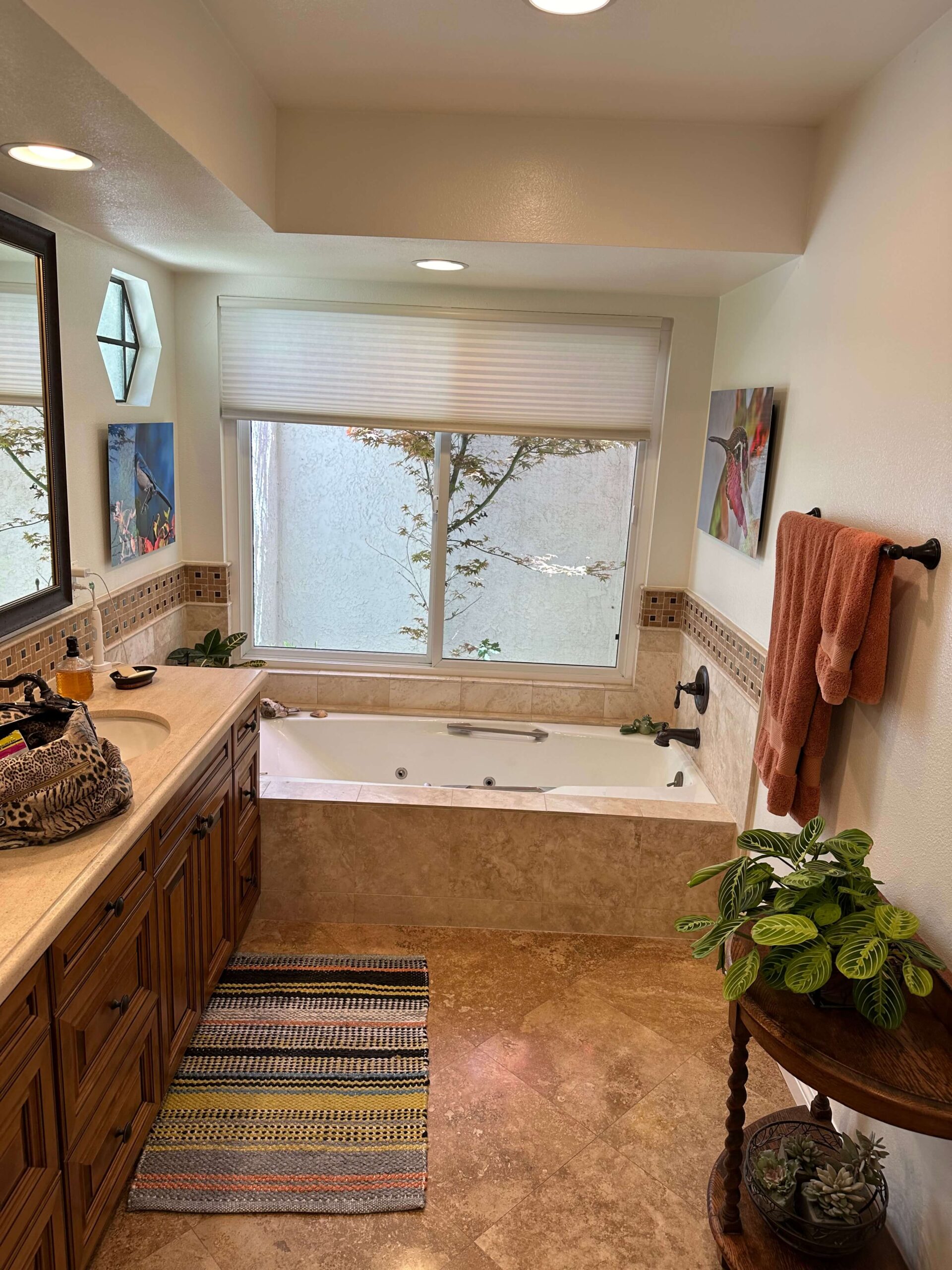 • Freestanding Soaking Tub: A beautiful new freestanding soaking tub became the focal point of the room, positioned beneath a large window for natural light and relaxation.