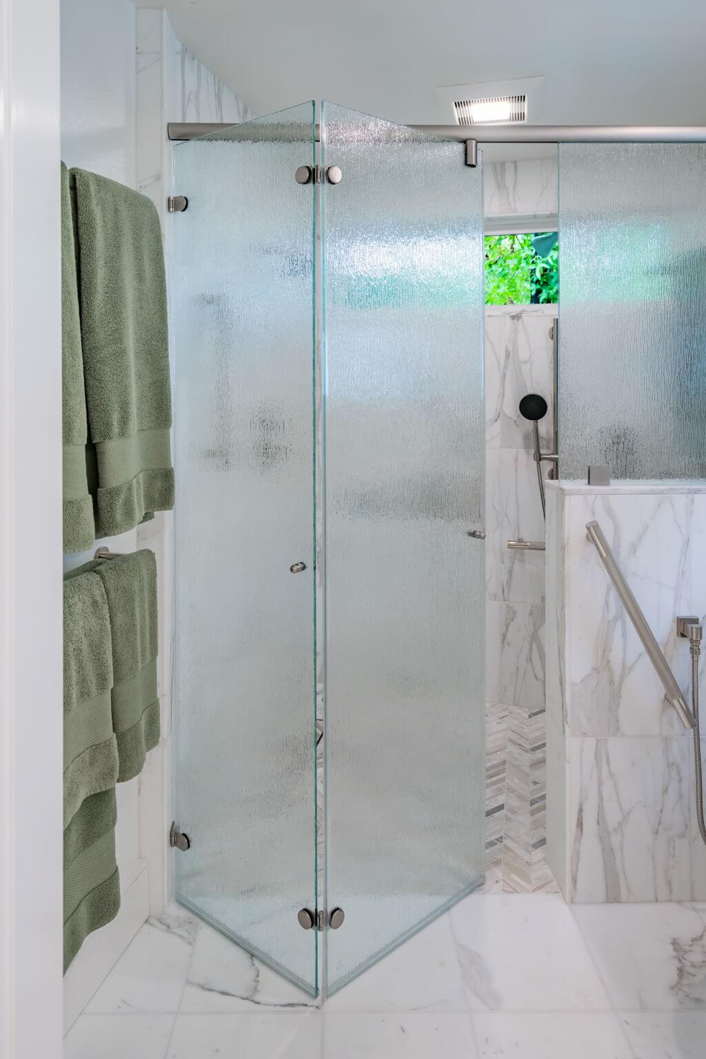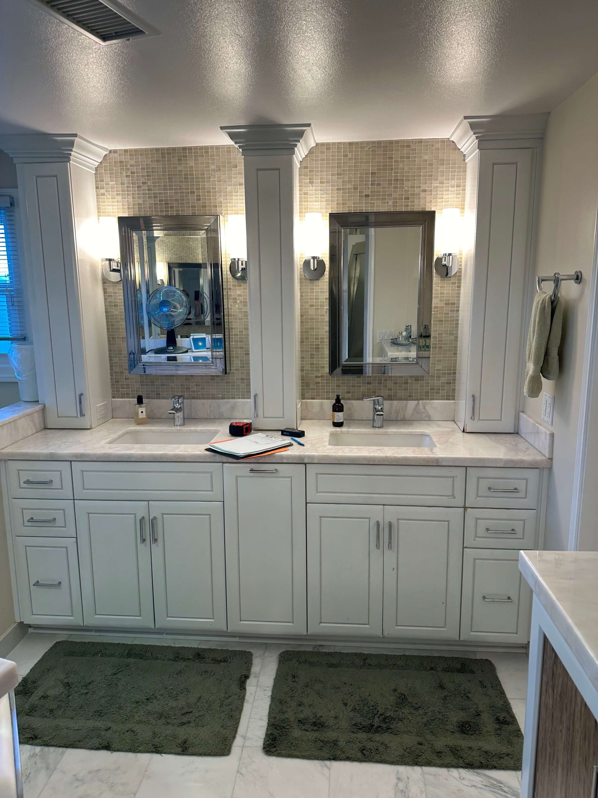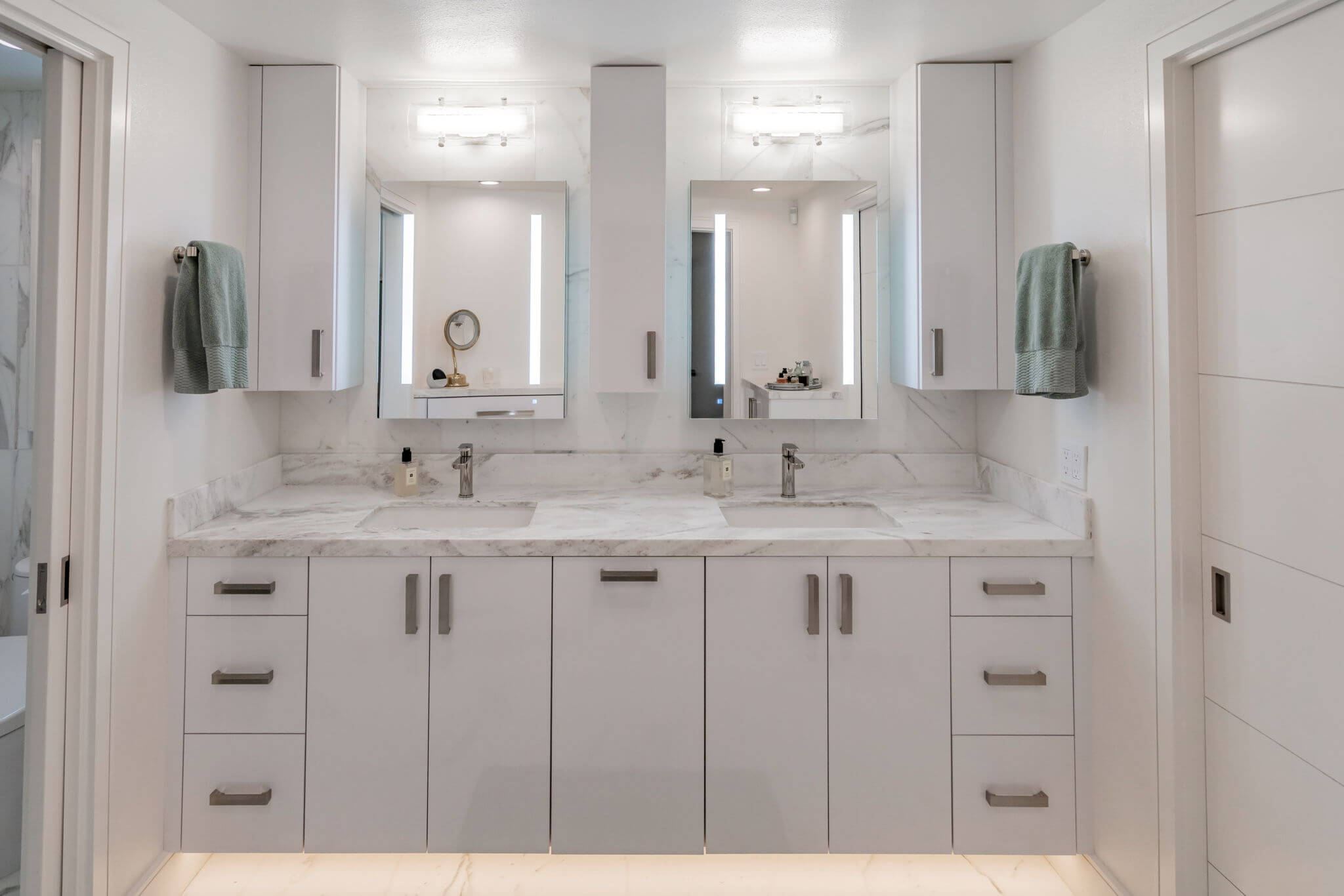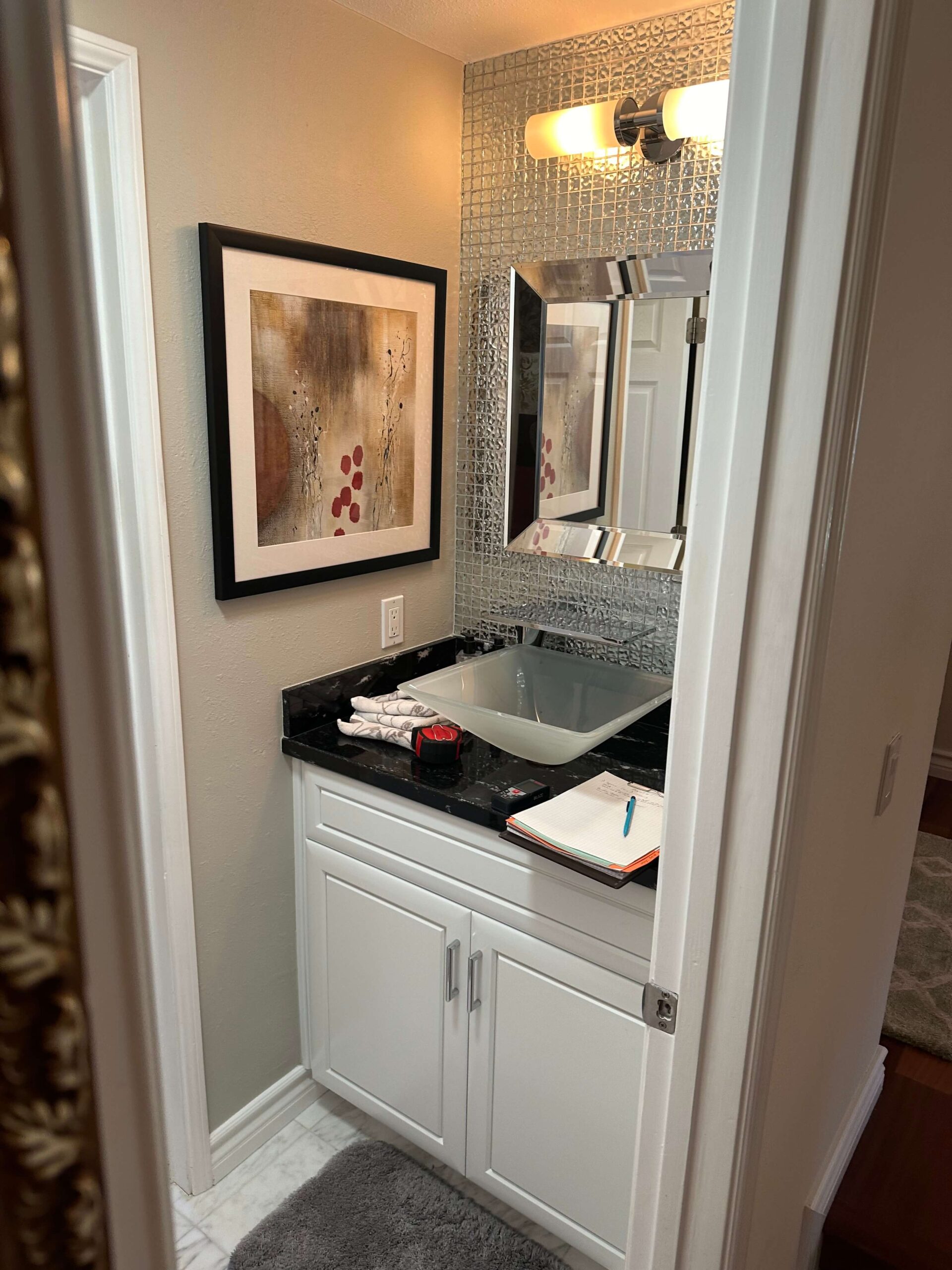 After: The redesign focused on contrast and calm. Clean surfaces, soft lighting, and balanced textures now give the room a spa-like feel while keeping it practical for daily use.