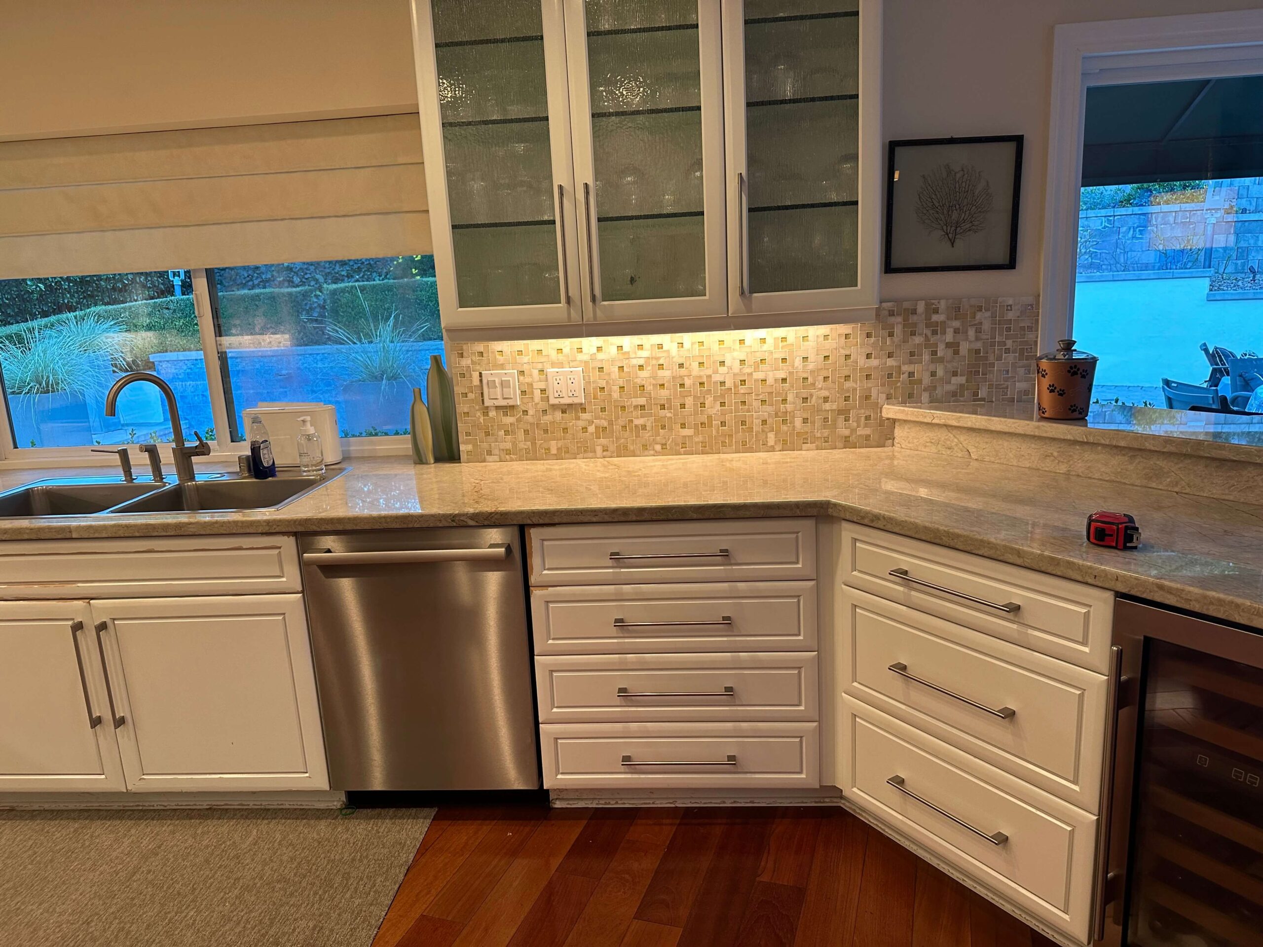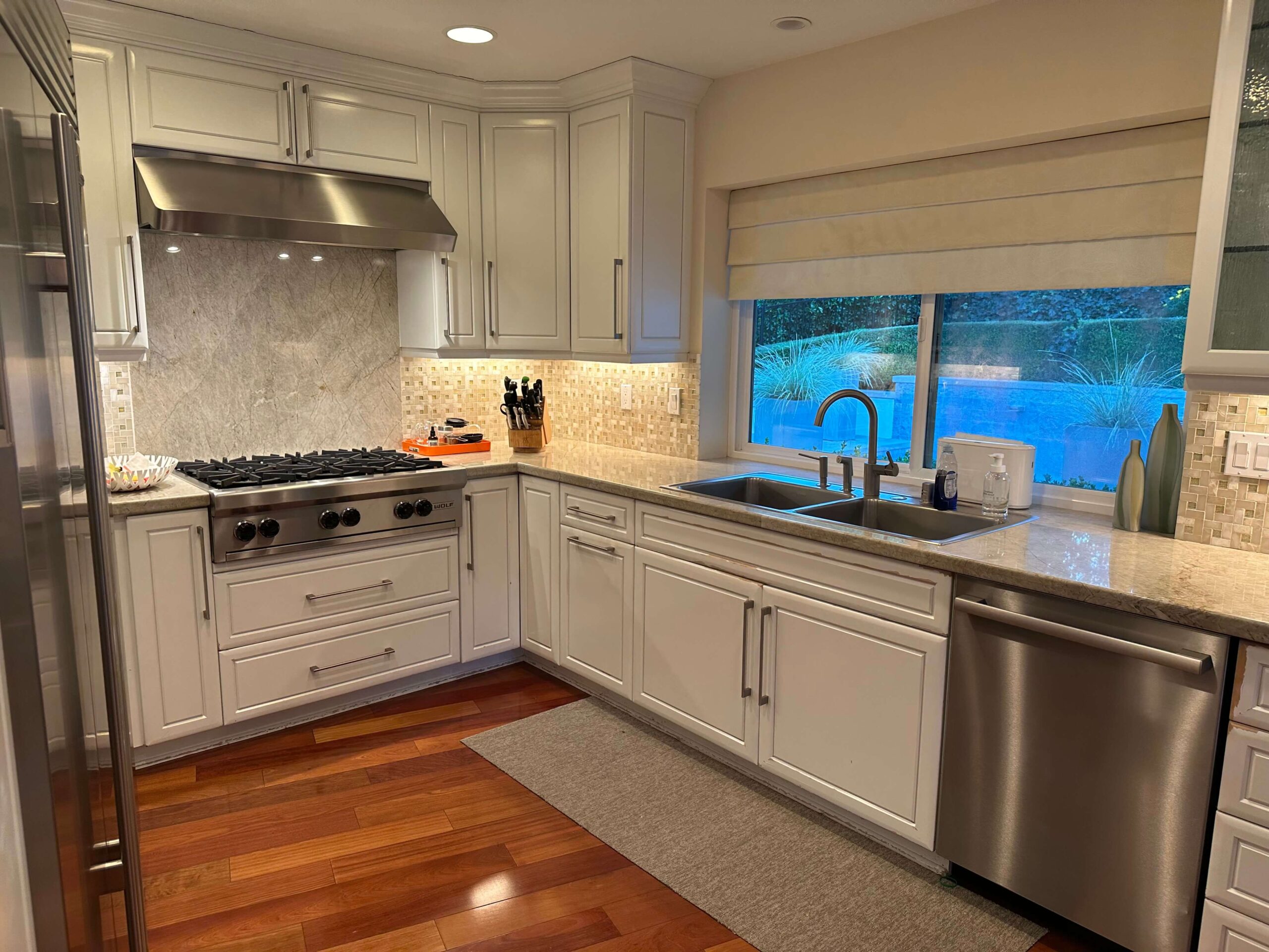 Before: The kitchen had traditional raised-panel cabinets, dark counters, and heavy wood tones that made the space feel small and dark.